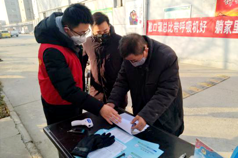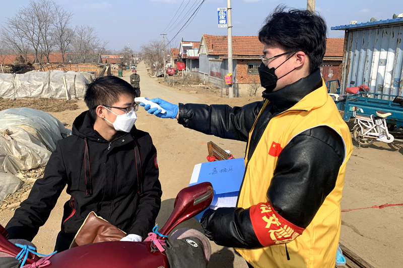 “请拿出您的上班证明和身份证,然后排队量下体温。”在山东省宁阳泗店镇后辛村的防控点上,戴着红袖章的瘦高女孩潘广慧正在熟练有序地指导村民进出村庄。